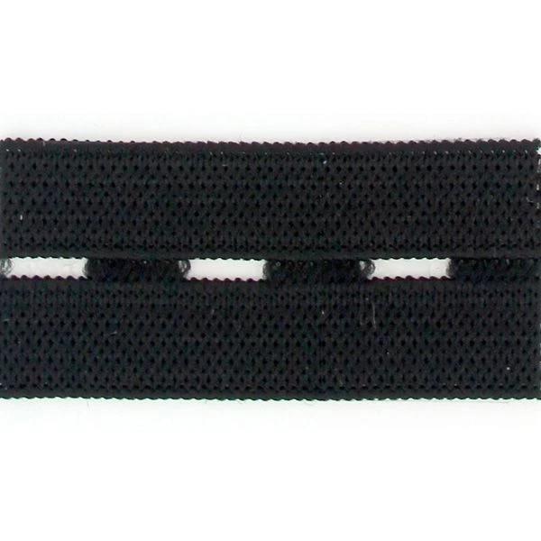 Button Hole Elastic is a knitted elastic that is 67% polyester, 33% rubber.