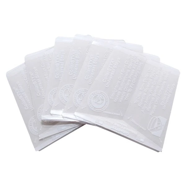 Apply to underside of collar. CollarSTYX instantly presses your collar and keeps it that way all day. Remove before washing.