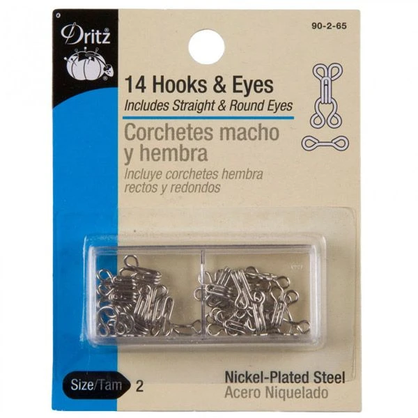 This package contains fourteen sets of size 2 hooks and eyes in either black or silver. Included are 14 hooks; seven round eyes and seven straight eyes.