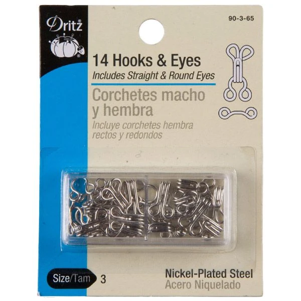 This package contains fourteen sets of size 3 hooks and eyes in either black or silver. Included are 14 hooks; seven round eyes and seven straight eyes.