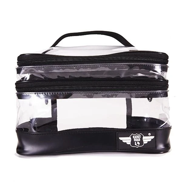 This clear slick beauty case unzips into 3 separate compartments.