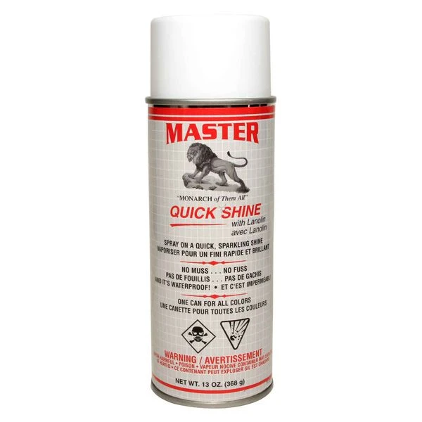 Spray on Master Quick Shine with Lanolin for an instant shine that brightens any smooth leather article.