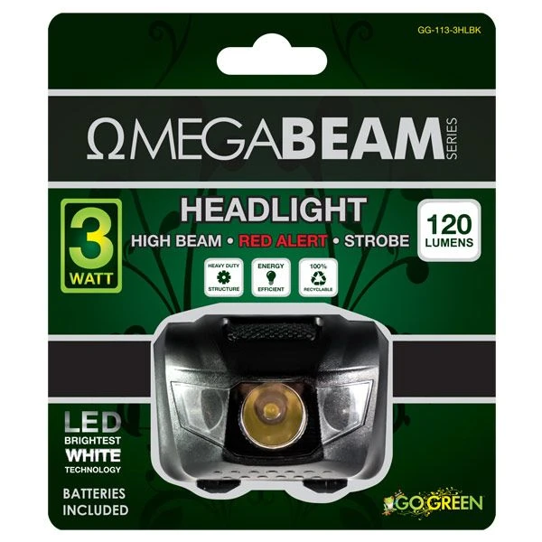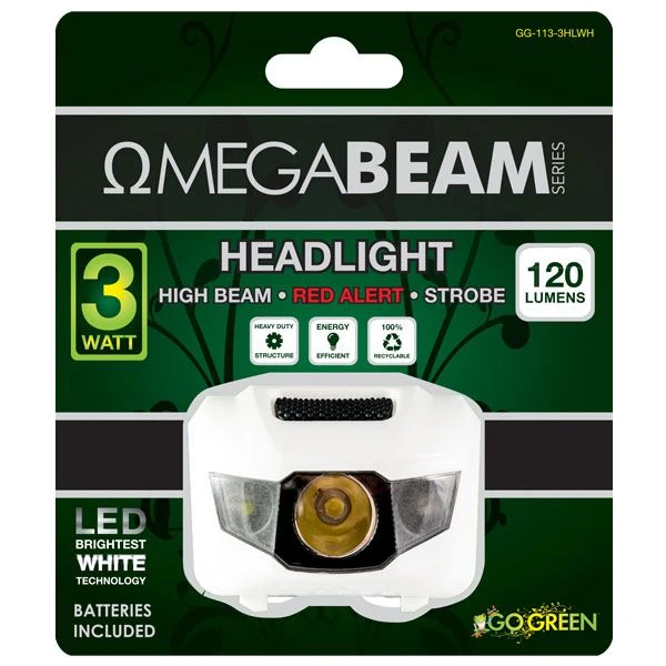 Omega Beams 3 watt LED high intensity headlight by Go Green power utilizes brightest White LED technology for a powerful focus beam.