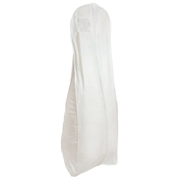 This floor-length, wedding gown hanging garment bag is breathable and comes with a center zipper.