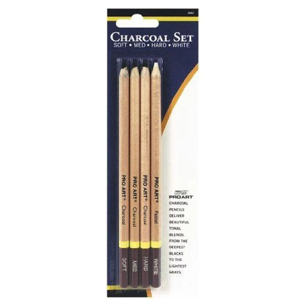 Pro Art Charcoal / White Drawing Pencil Set contains 3 grades of charcoal pencils plus a white sketching pencil.Â