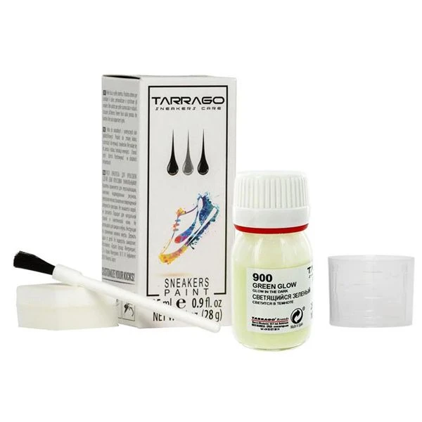 Tarrago Sneakers Paint Glow in the Dark is the only paint with a water-based photoluminescence color dye specially formulated to customize your smooth leather, synthetic leather or canvas sneakers.