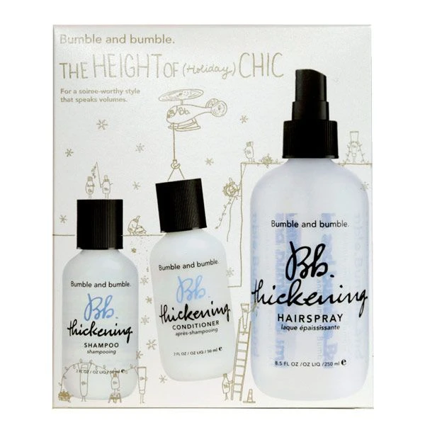 Bumble and bumble Thickening Trio Set contains: 2 oz Bb Thickening Shampoo, 2 oz Bb Thickening Conditioner, and 8.5 oz Bb Thickeing Hairspray.